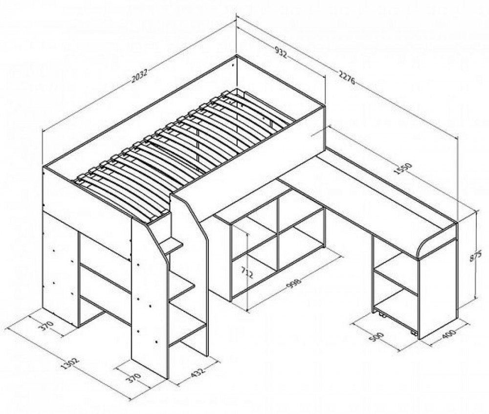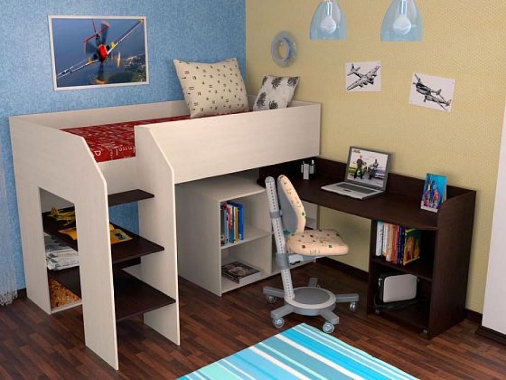 Компактный детский уголок "Теремок-2" объединяет в себе спальное и рабочее место детской комнаты. Под спальным местом располагается стеллаж и пиьсменный стол. Экономия пространства достигается за счет складывающейся конструкции стола. Кровать рассчитана на детей в возрасте от 3 до 18 лет.